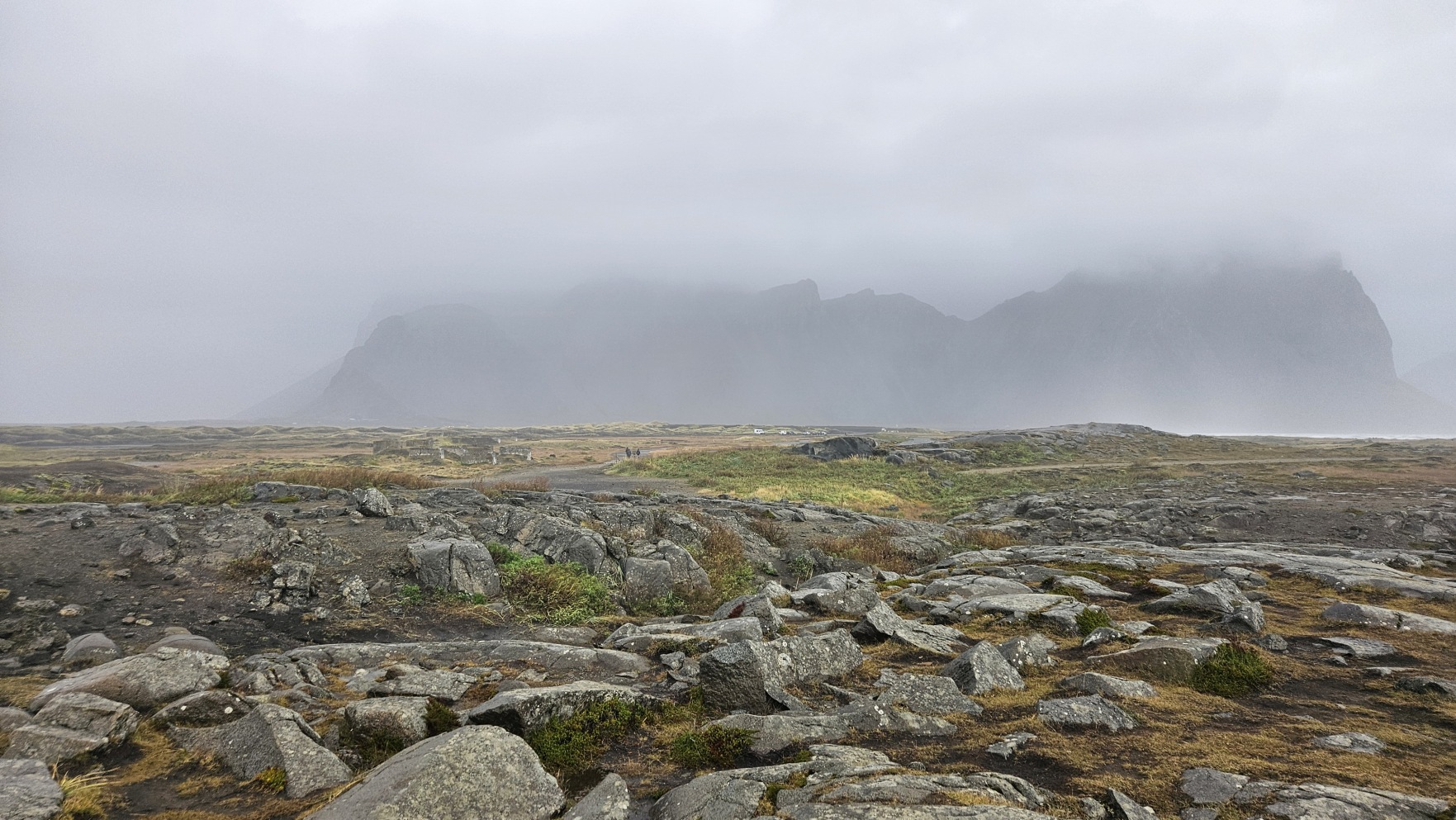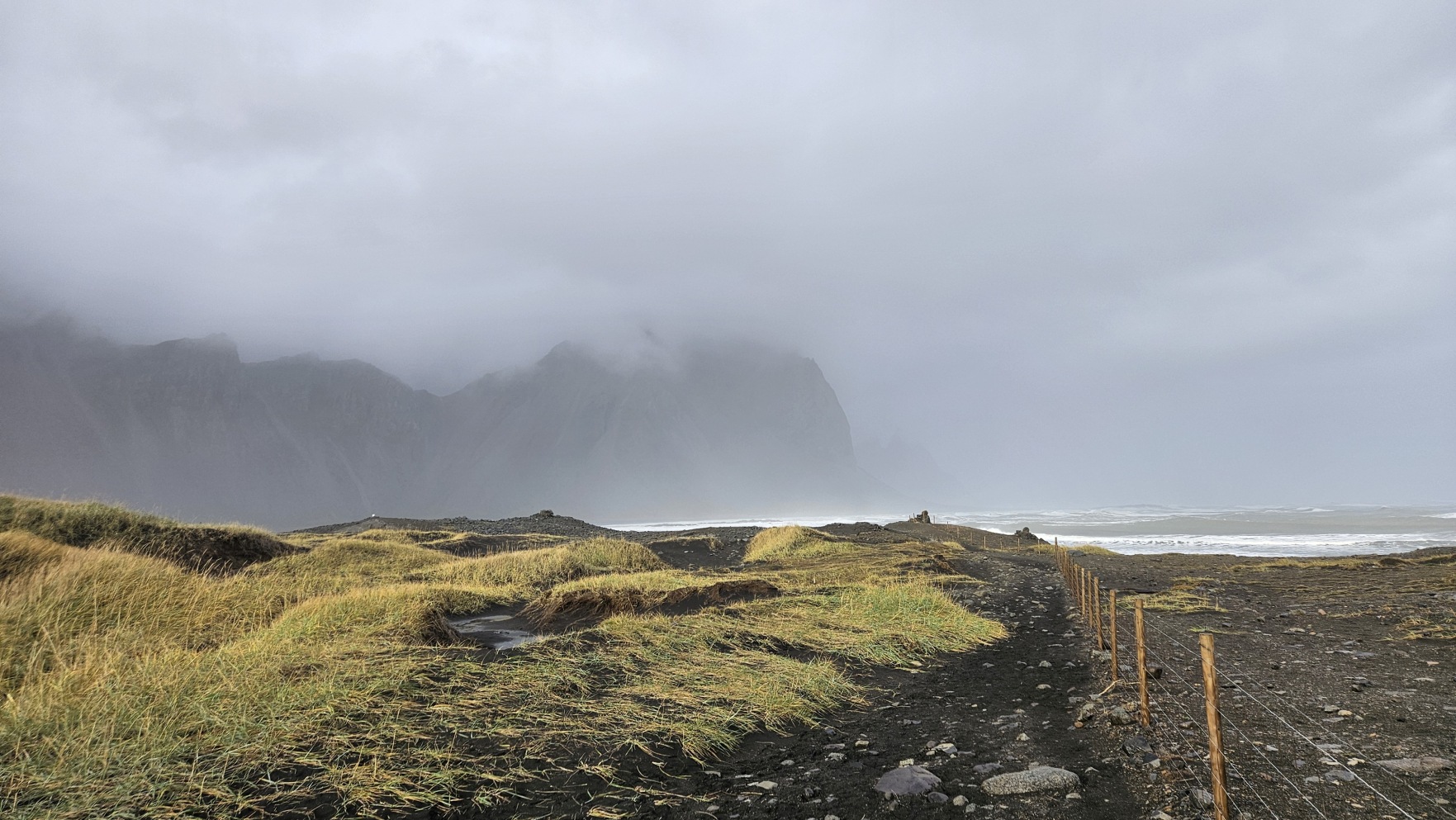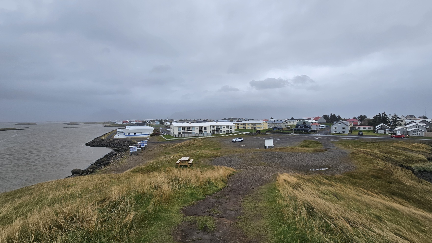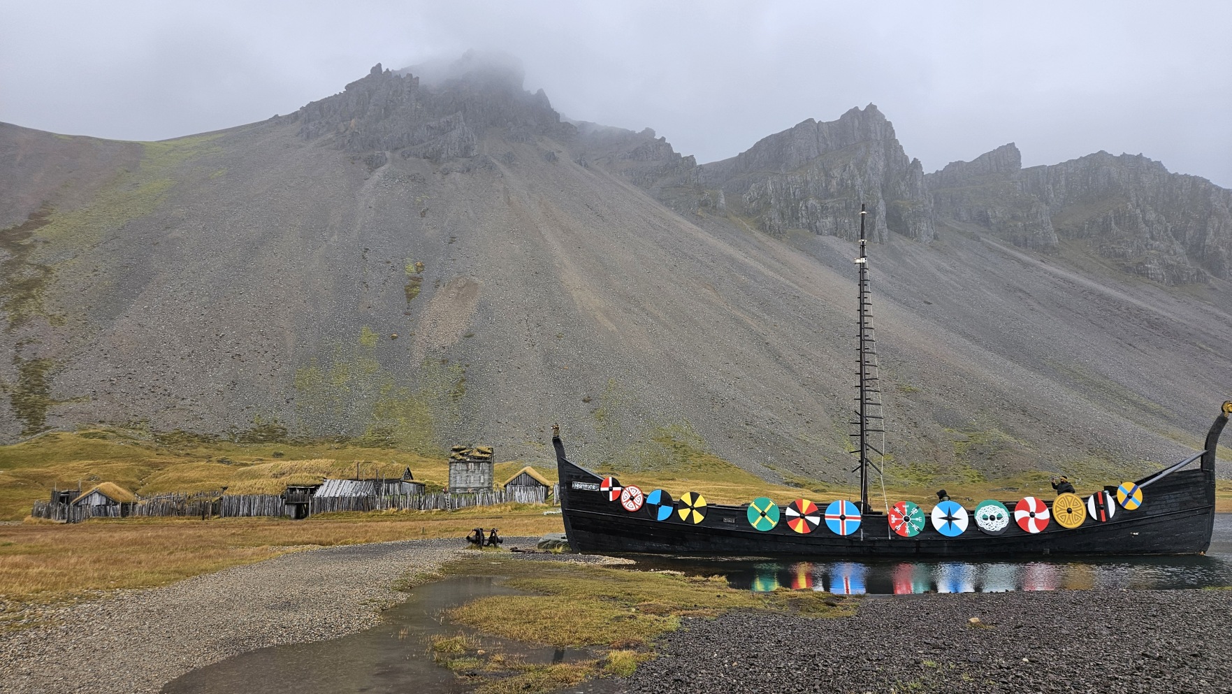 Zahaczy艂em o miasteczko H枚fn, 偶eby zrobi膰 tam zakupy w Netto, nabra膰 ciep艂ej wody i przej艣膰 si臋. Chcia艂em jecha膰 dalej, ale tunel na krajowej drodze nr 1, niedaleko za miastem, by艂 zamkni臋ty z powodu uszkodzenia drogi za samym tunelem, przez obfite opady. Mia艂 otworzy膰 si臋 najwcze艣niej jutro po po艂udniu… Zatrzyma艂em si臋 wi臋c, ca艂e szcz臋艣cie w bardzo 艂adnym miejscu, Stokksnes. Z pla偶膮, latarni膮 morsk膮 i wiosk膮 Wiking贸w na potrzeby planu filmowego lata temu. Jest to teren prywatny i wst臋p jest p艂atny, za co w艂a艣ciciele spotykaj膮 si臋 z siln膮 dezaprobat膮 w opiniach na Googlach, ale ja cieszy艂em si臋, 偶e mog臋 sp臋dzi膰 tutaj noc, bo by艂o pi臋knie. Nie do ko艅ca „zgodnie z regulaminem”, bo nie chcia艂em sta膰 w rz膮dku innych kamper贸w przy recepcji, na oficjalnym kempingu, wola艂em miejsca parkingowe bli偶ej pla偶y.