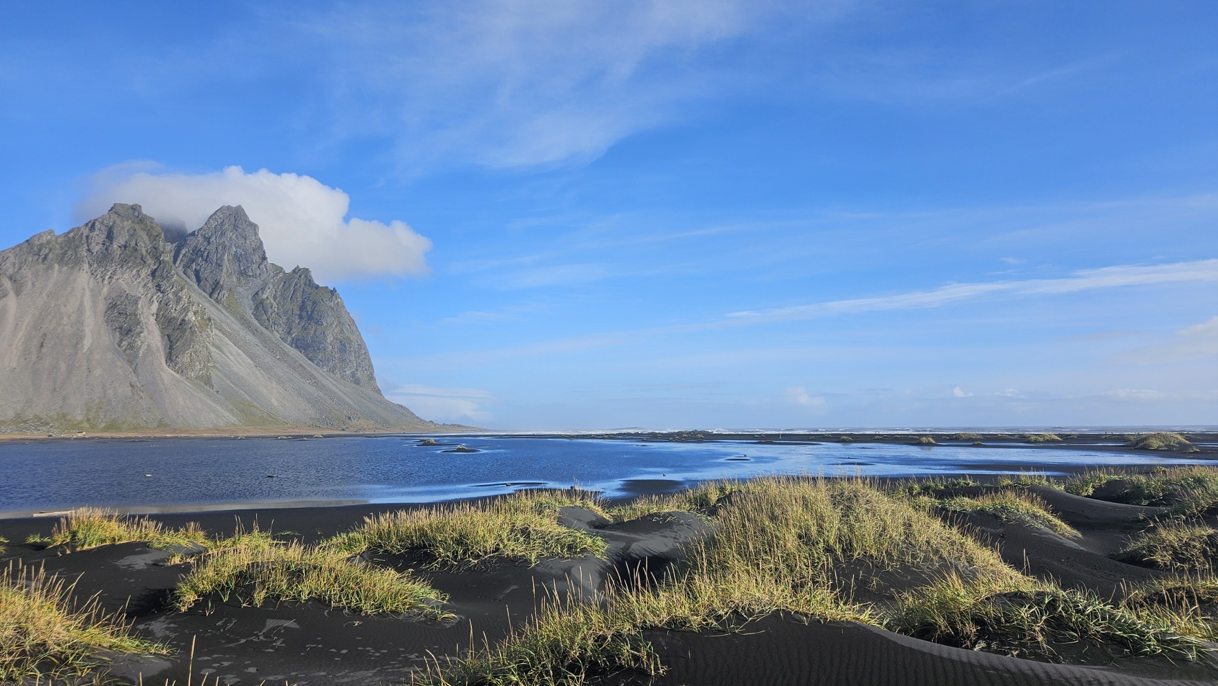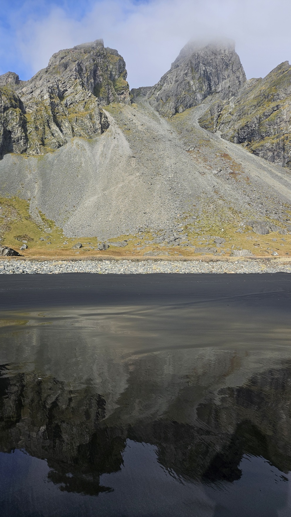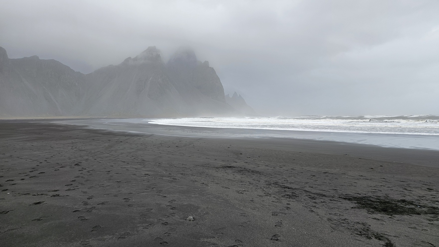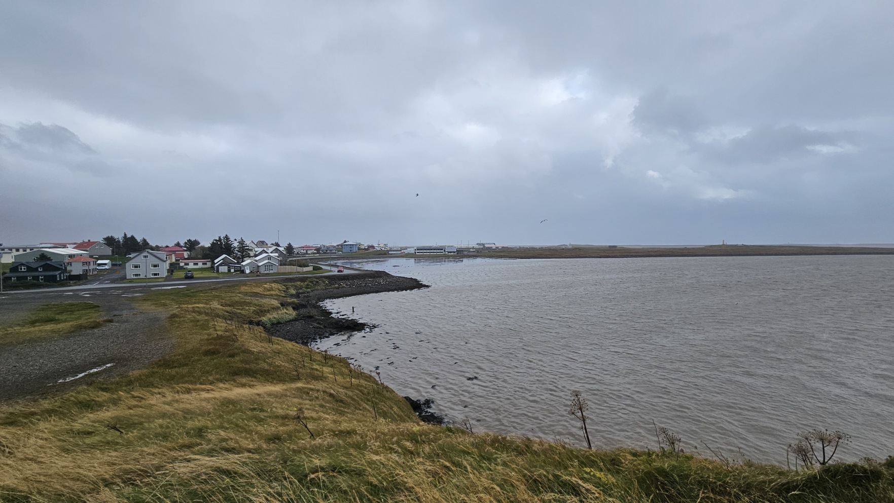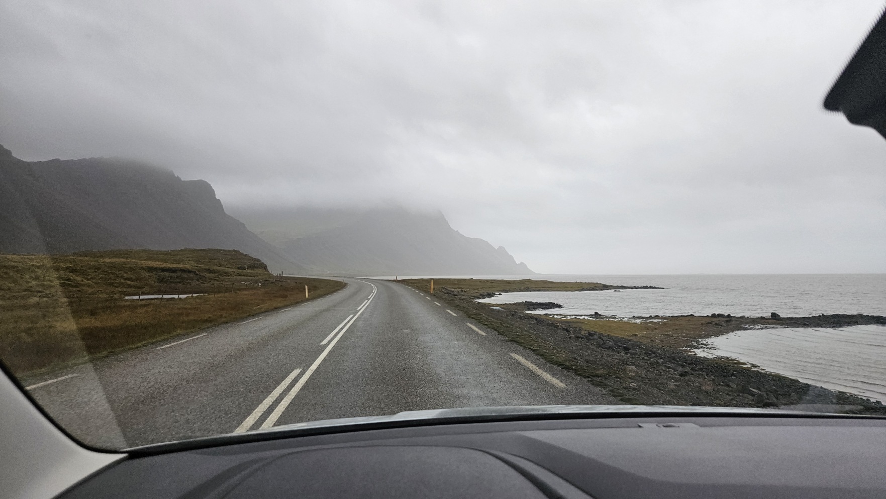 Zahaczy艂em o miasteczko H枚fn, 偶eby zrobi膰 tam zakupy w Netto, nabra膰 ciep艂ej wody i przej艣膰 si臋. Chcia艂em jecha膰 dalej, ale tunel na krajowej drodze nr 1, niedaleko za miastem, by艂 zamkni臋ty z powodu uszkodzenia drogi za samym tunelem, przez obfite opady. Mia艂 otworzy膰 si臋 najwcze艣niej jutro po po艂udniu… Zatrzyma艂em si臋 wi臋c, ca艂e szcz臋艣cie w bardzo 艂adnym miejscu, Stokksnes. Z pla偶膮, latarni膮 morsk膮 i wiosk膮 Wiking贸w na potrzeby planu filmowego lata temu. Jest to teren prywatny i wst臋p jest p艂atny, za co w艂a艣ciciele spotykaj膮 si臋 z siln膮 dezaprobat膮 w opiniach na Googlach, ale ja cieszy艂em si臋, 偶e mog臋 sp臋dzi膰 tutaj noc, bo by艂o pi臋knie. Nie do ko艅ca „zgodnie z regulaminem”, bo nie chcia艂em sta膰 w rz膮dku innych kamper贸w przy recepcji, na oficjalnym kempingu, wola艂em miejsca parkingowe bli偶ej pla偶y.