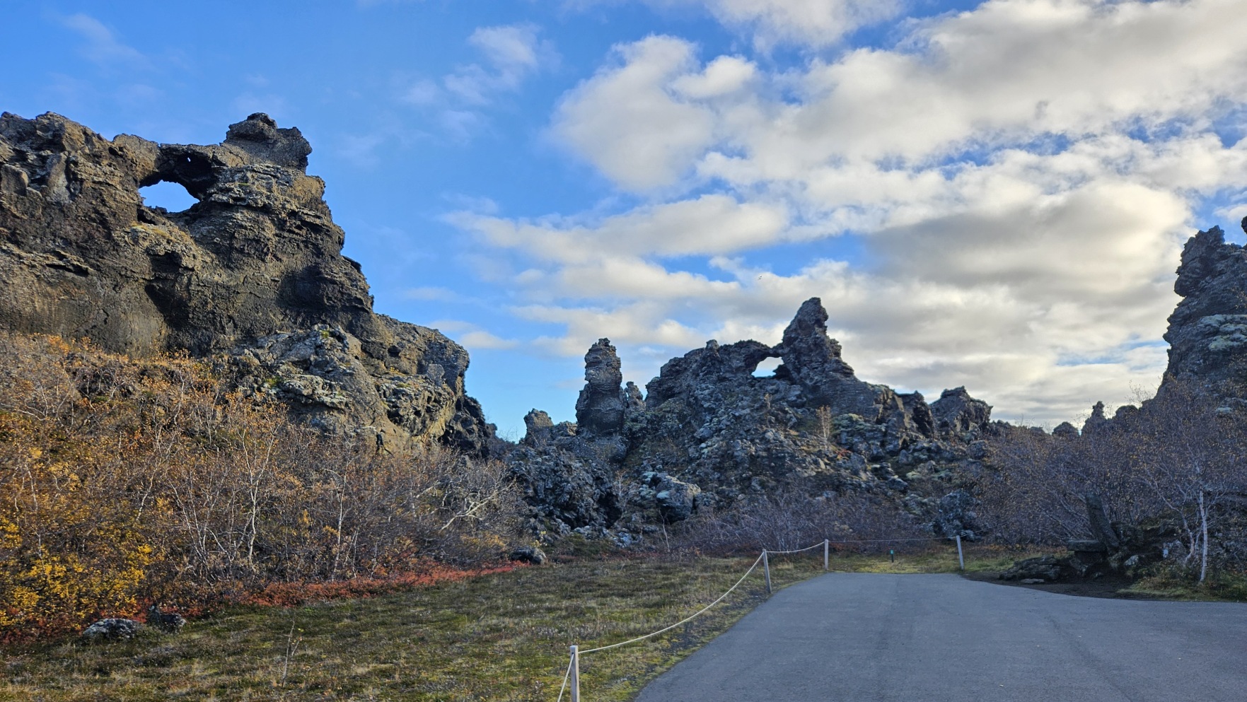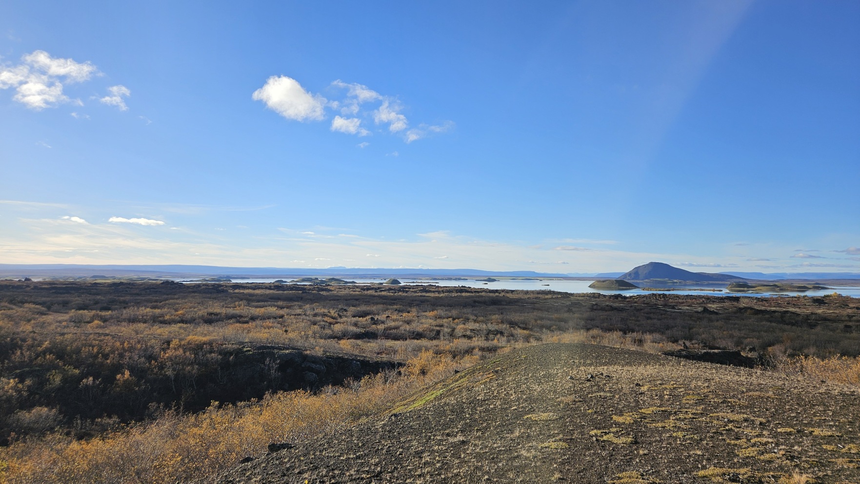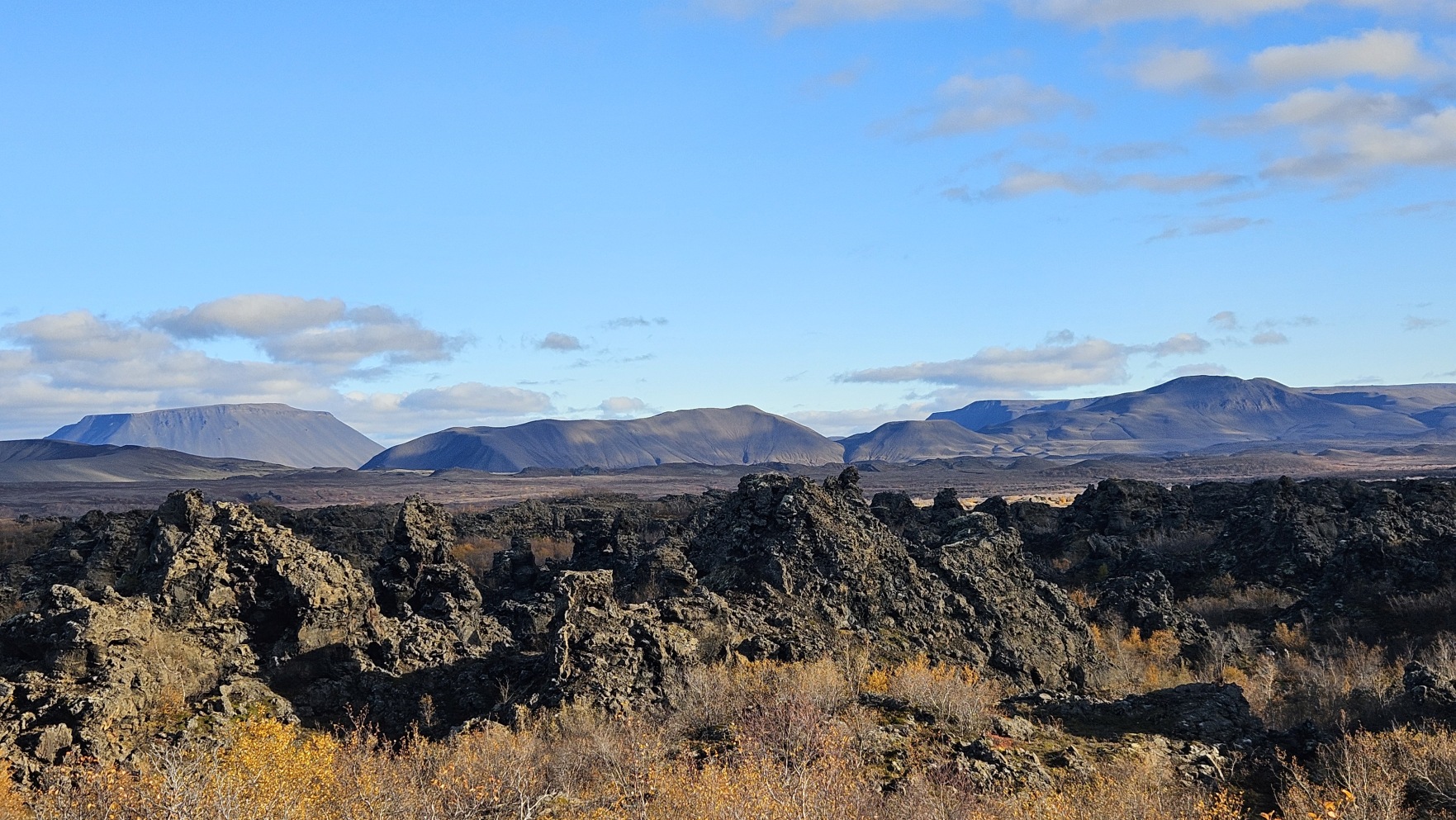 Chwil臋 dalej znajdowa艂y si臋 ciekawe formacje z zastyg艂ej lawy, Dimmuborgir i punkt widokowy na jezioro Myvatn, Sk煤tusta冒ag铆gar.